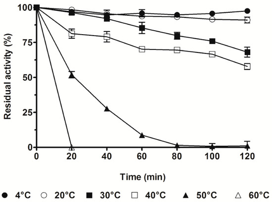 Thermal stability of SpG6PD1. SpG6PD1 enzyme in buffer A was aliquoted and then incubated at 4, 20, 30, 40, 50, and 60 °C for the indicated time, after which SpG6PD1 activity was measured in the reaction mixture with NADP+ as a cofactor, at 30 °C for 2 min. The catalytic activity at 30 °C before incubation was considered 100%. Data correspond to the value ± SD of three independent experiments.