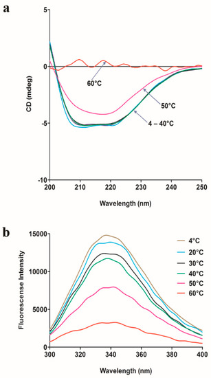 The effect of temperature on the secondary structure and tertiary structure of SpG6PD1 was evaluated by measuring the circular dichroism (CD) spectra in the far-UV region (200–250 nm) and the intrinsic protein fluorescence upon excitation at 280 nm, respectively. The spectroscopic results show that SpG6PD1 maintains the tertiary structure at 4–20 °C, whereas the secondary structure is maintained between 4–40 °C; both structures are completely denatured at 60 °C after 1 h of incubation (Figure 5).