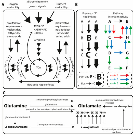 (A) Maintaining ATP is performed with extreme precision. This causes metabolic ripple effects throughout the metabolism. Glycolysis and tricarboxylic acid (TCA) cycle are central nodes in this. (B) Metabolic homeostasis can be maintained primarily by the mechanics of regulation of fluxes (left) and alternative pathways or shunts for diversion of metabolic flow. (C) Conversion of glutamine to glutamate is most often associated with the enzyme glutaminase (GLS). There are, however, at least 11 other paths between these metabolites with experimental evidence. (1) glutamate dehydrogenase 1 (GLUD1), (2) phosphoserine aminotransferase (PSAT1), (3) tyrosine aminotransferase (TAT), (4) aspartate aminotransferase 1 (GOT1), (5) alanine aminotransferase 1 (GPT), (6) 4-aminobutyrate aminotransferase, mitochondrial (ABAT), (7) kynurenine/alpha-aminoadipate aminotransferase (AADAT), and (8) ornithine aminotransferase (OAT).