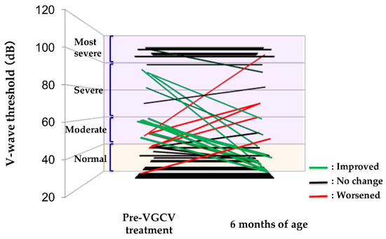 Wave-V threshold was determined before the start of treatment (baseline) and 6 months after birth using the method mentioned above. Hearing improvement/exacerbation was defined as a ≥20 dB decrease/increase in this value from baseline to the sixth-month time point; hearing maintenance was defined when the wave-V threshold was the same, or the change was within 20 dB [20,21].