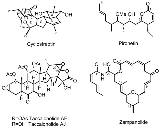 - Buey, R.M.; Calvo, E.; Barasoain, I.; Pineda, O.; Edler, M.C.; Matesanz, R.; Cerezo, G.; Vanderwal, C.D.; Day, B.W.; Sorensen, E.J.; et al. Cyclostreptin binds covalently to microtubule pores and lumenal taxoid binding sites. Nat. Chem. Biol. 2007, 3, 117–125. [Google Scholar] [CrossRef] [PubMed]