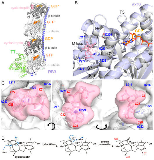 - Prota, A.E.; Setter, J.; Waight, A.B.; Bargsten, K.; Murga, J.; Diaz, J.F.; Steinmetz, M.O. Pironetin binds covalently to αcys316 and perturbs a major loop and helix of α-tubulin to inhibit microtubule formation. J. Mol. Biol. 2016, 428, 2981–2988. [Google Scholar] [CrossRef]