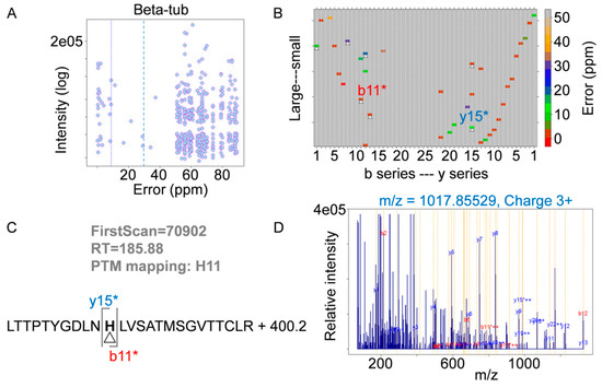 Mass spectrometry analyses of the cyclostreptin-tubulin adduct. (A) Vseq results of the cyclostreptin adduct of the beta tubulin-derived tryptic peptide spanning the sequence LTTPTYGDLNHLVSATMSGVTTCLR. Low error fragments (less than 30 ppm) were intense signals in the corresponding fragmentation spectrum and belong to one of the main fragmentation series derived by HCD (b and y series) as can be observed in (B). (C) Pinpointing of the exact position of the cyclostreptin modification. Vseq determined the Dmass corresponding to cyclostreptin (400.2 Da) and it mapped the modification in the H11 residue, since b11 and y15 fragments were unambiguously detected with the Dmass (labeled as a white triangle in (B) and with an * in (C)). The corresponding fragmentation spectrum showing the different fragments assigned is displayed in (D).