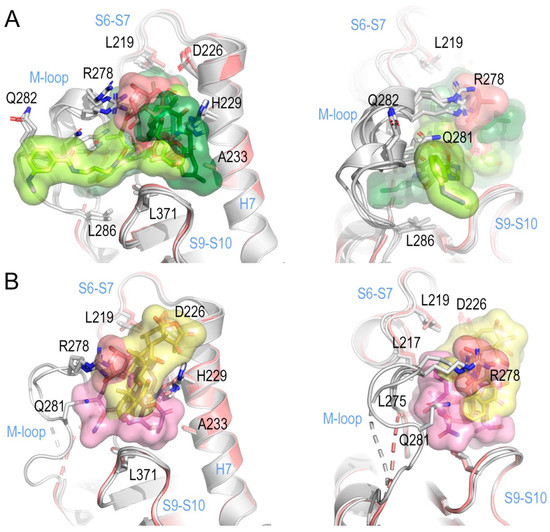 To gain further insight into the detailed mechanism that controls M-loop structuring, we superimposed all available crystal structures of taxane-site ligand-tubulin complexes and compared the ligand environment in the binding site. Based on the observed structural features, these taxane-site ligands can be subdivided into two groups, those that induce helical M-loop structuring, and those that show little to no effect on M-loop conformation (Figure 4). All ligands show common hydrophobic interaction points with helices βH6, βH7 and the M-loop base to different extents, which comprise βLeu217, βLeu219, βLeu230, βAla233, and βLeu275, and both the reactive side chains of βAsp226 and βHis229.