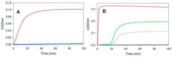 Time course of assembly of 25 μM tubulin in 10 mM sodium phosphate, 1 mM ethylene diamine tetraacetic acid (EDTA), 1 mM GTP, pH 7.0 supplemented with either (A) 3 mM or (B) 7 mM MgCl2, final pH 6.7 in the presence of 27.5 μM zampanolide (red line), taccalonolide AJ (green line), cyclostreptin (blue line) or dimethylsulfoxide (DMSO) (vehicle, black line).