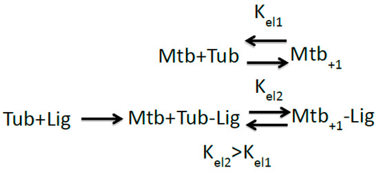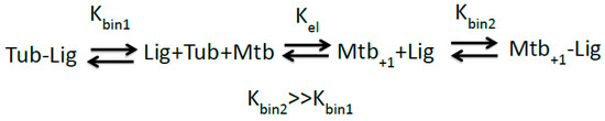 A detailed understanding of the structural and thermodynamic mechanisms employed by covalent microtubule stabilizers is crucial in order to design and develop compounds with optimal properties. The thermodynamic properties of the binding of non-covalent microtubule stabilizers are based on the difference in affinity of the ligand between the unassembled tubulin heterodimer Kbin1 (Scheme 1) and the assembled microtubule Kbin2. Compounds that have higher affinity for the polymerized state than for the unassembled curved state Kbin2>>Kbin1 displace the assembly equilibrium towards the right part of the reaction by decreasing the free concentration of unliganded microtubules [Mtb+1] towards the liganded assembled species [Mtb+1-Lig] [24,29] (Scheme 1).