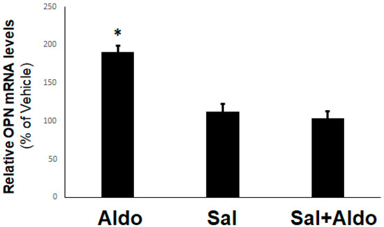 Since aldosterone is a well-documented cardio-toxic hormone mediating adverse remodeling, including cardiac fibrosis [27], we first examined the effect of this mineralocorticoid on OPN expression in H9c2 cardiac cells. As shown in Figure 1, aldosterone treatment for 2 h caused a rapid upregulation of OPN mRNA levels, indicating that OPN is an immediate/early response gene for aldosterone in H9c2 cardiac cells, consistent with previous studies demonstrating this in renal and other cell/tissue types [20,28].
