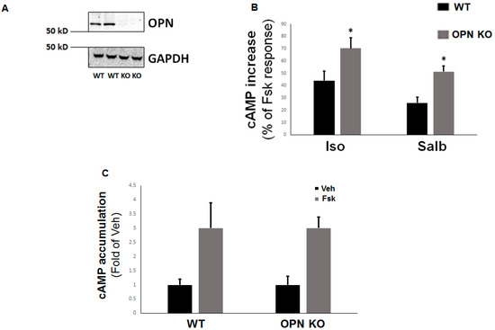 Since the β2AR inhibits OPN upregulation in H9c2 cardiomyocytes (an effect consistent with this receptor’s anti-fibrotic actions in the heart), we posited that there is perhaps a negative feedback loop operating in cardiac myocytes allowing OPN to reciprocally regulate (inhibit) β2AR function and signaling. To this end, we deleted the OPN gene in H9c2 cells via CRISPR and compared the extent of cAMP accumulation—the major second messenger generated by βARs regulating cellular fibrosis [16]—between cells having OPN deleted (OPN-knockout (KO) cells) and wild type (WT) cells. After confirming the genetic deletion of OPN at the protein level (Figure 2A), we stimulated the cells with either isoproterenol to activate both β1ARs and β2ARs or salbutamol to selectively activate only the β2ARs and measured acute cAMP generation.