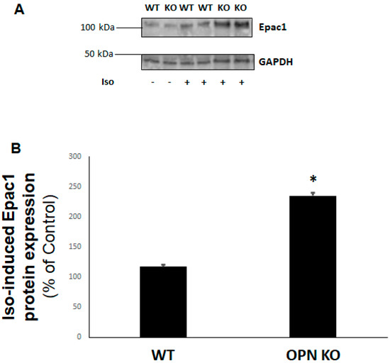 Enhanced βAR-dependent Epac1 protein levels in the absence of OPN in H9c2 cardiomyocytes (Epac: exchange protein directly activated by cAMP). H9c2 cells were treated with 10 µM isoproterenol (Iso) or vehicle for 24 h in the presence (WT) or absence (KO) of OPN, then cells were harvested and total protein extracts prepared for Epac1 immunoblotting. Representative blots are shown in (A), including GAPDH as loading control, and the densitometric quantitation of three independent experiments per condition performed in duplicate is shown in (B). *, p < 0.05, n = 3.