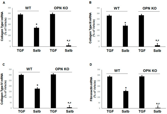 Absence of OPN potentiates the β2AR-mediated inhibition of TGFβ-dependent profibrotic factor mRNA induction in H9c2 cells. mRNA levels of (A) type I collagen, (B) type III collagen, (C) type IV collagen, and (D) fibronectin, in WT or OPN-depleted (OPN KO) H9c2 cells treated with 10 ng/mL TGF-β1 (TGF) with or without 10 µM salbutamol (Salb). *, p < 0.05, vs. TGF; #, p < 0.05, vs. WT-Salb; n = 3 independent experiments per condition (two-way ANOVA with Bonferroni test).