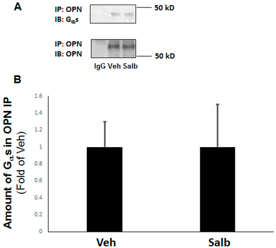OPN opposes β2AR signaling via physical interaction with Gαs in H9c2 cardiomyoblasts. Co-immunoprecipitation (co-IP) of OPN with Gαs in native WT H9c2 cells treated with vehicle (Veh) or 10 µM salbutamol (Salb). Representative blots are shown in (A), and the densitometric quantitation of three independent experiments is shown in (B). IB: immunoblotting; IP: immunoprecipitation; IgG: IP with a general IgG antibody (negative control for the OPN IP). No significant difference (at p = 0.05) in the amount of Gαs co-IP’d with OPN was observed between Veh and Salb (n = 3).