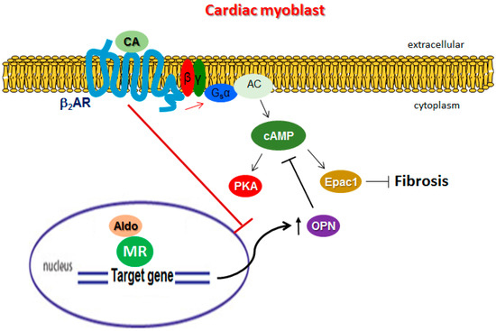 Schematic illustration of the proposed role of OPN in β2AR ant-fibrotic signaling in H9c2 cardiomyocytes. CA: catecholamine; MR: mineralocorticoid receptor. See text for details and for all other molecular acronym descriptions.