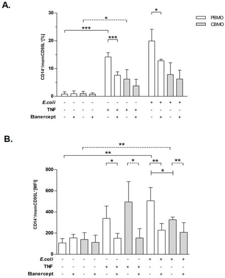 - Dreschers, S.; Gille, C.; Haas, M.; Grosse-Ophoff, J.; Schneider, M.; Leiber, A.; Bühring, H.-J.; Orlikowsky, T.W. Infection-induced bystander-apoptosis of monocytes is TNF-alpha-mediated. PLoS ONE 2013, 8, e53589. [Google Scholar] [CrossRef]