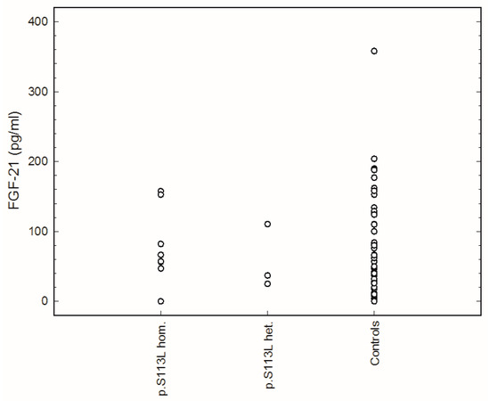 Fibroblast growth factor 21 (FGF-21) serum concentration in controls and patients with carnitine palmitoyltransferase II (CPT II) deficiency (p.S113L hom.: patients homozygous for the common p.S113L mutation; p.S113L het.: Patients with p.S113L on one allele and another mutation on other allele. The detailed genotype of all patients is illustrated in Table 1).