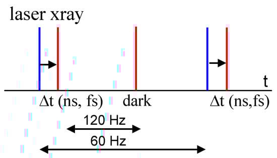 A time-resolved macromolecular crystallography (TRX) experiment with the pump–probe method. The pump laser pulse (blue bar) starts the reaction, and the ultrashort X-ray pulse (red bar) probes the progress of the reaction after a time delay, ∆t. Here, X-ray data collection in the dark as the reference is interleaved with data collection after laser light activation. The X-ray data collection rate is 120 Hz, as available at the LCLS, and the laser repetition rate is 60 Hz in this example.