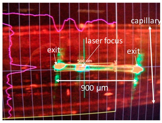 Screenshot of a photoactive yellow protein (PYP) crystal (pale yellow) displayed on a monitor at the XPP instrument of the LCLS during laser illumination. The crystal of size 900 × 40 × 40 µm3 is kept in a glass capillary. It is illuminated by a femtosecond laser pulse (laser focus). The crystal apparently acts as a waveguide, with the laser light exiting at both ends.