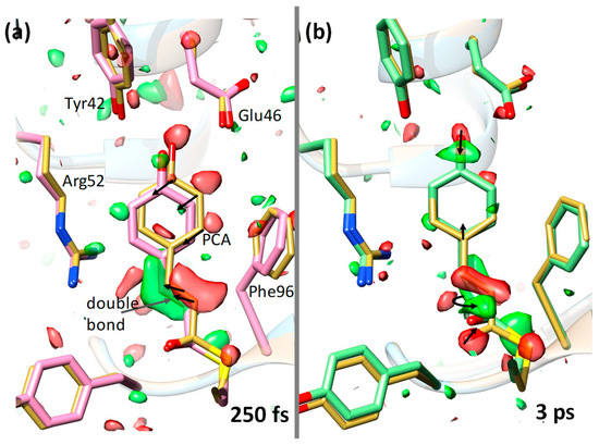 Ultrafast structural changes in the chromophore pocket of PYP [5] Green represents a positive difference electron density and red a negative difference electron density (on the 3/-3 σ contour level). Yellow structure represents a reference (dark state) structure. The p-coumaric acid (PCA) chromophore as well as some nearby residues are marked. (a) 250 fs after laser excitation (pink structure); the chromophore configuration is still trans. Larger structural changes are denoted by arrows. (b) 3 ps after laser excitation (green structure); the structure is cis. Isomerization occurred about the double bond (curved arrow) at the chromophore tail. Some structural changes are also shown by arrows.