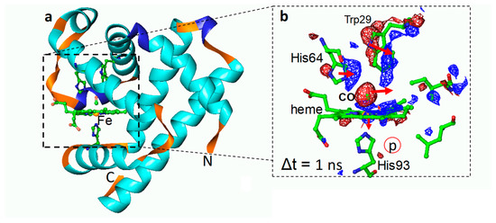 - Schlichting, I.; Berendzen, J.; Phillips, G.N.; Sweet, R.M. Crystal-Structure of Photolyzed Carbonmonoxy-Myoglobin. Nature 1994, 371, 808–812. [Google Scholar] [CrossRef] [PubMed]