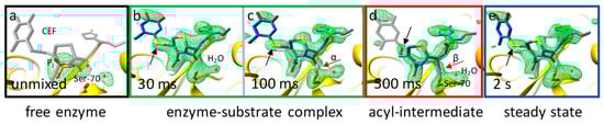 The catalytic reaction of the M. tuberculosis BlaC with CEF has been observed from 30 ms to 2 s with MISC experiments performed at the LCLS [64,124]. CEF is already fully occupied in the catalytic cleft at 30 ms (Figure 6b). Next, the Ser-70 residue of the enzyme attacks the β-lactam ring (Figure 6c,d). This nucleophilic attack does not only open the ring, but also leads to the simultaneous release of a leaving group (R) from CEF. Very little evidence of this process is present at both 30 ms and 100 ms. However, at 500 ms, a covalent bond between CEF and Ser-70 has formed (Figure 6d). Since the leaving group’s electron density is not well resolved due to high mobility, its ring electron density is a poor indicator of its presence (or release). The missing density on the sulfur atom of the leaving group, however, indicates that this group is split off. At 30 ms to 100 ms, the structure of the enzyme–substrate complex, and at 500 ms, the structure of the acyl complex can be determined. Two seconds after mixing, the situation is not that clear; apparently, the enzyme-substrate (ES) complex reappears (Figure 6e). The electron density looks similar to those for the 30-ms and 100-ms time delay. Since 2 s is a timepoint well in the steady state of the enzyme, one would expect that the most stable state, which should be the acyl complex, dominates the electron density. However, this is not the case, since the ES complex is observed at 2 s. A more quantitative view is obtained when the coupled differential equations of the kinetic mechanism are integrated. The concentration profiles obtained can then be compared to the results from the MISC experiment. A compatible concentration profile can only be obtained when the rate of the nucleophilic attack reaction of Ser-70 onto the β-lactam ring is effectively blocked. Only then does the ES complex accumulate in the steady state. Although product inhibition has been known for cephalosporin substrates [127], this is the first time that such an inhibition has been proposed based on structural evidence, and may be useful for therapeutic applications. Additional experiments with closely spaced time points are necessary to determine the exact mechanism(s) of this inhibition.
