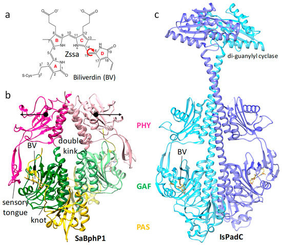 Bacterial phytochrome structures. (a) Structure of the central chromophore, biliverdin (BV). In dark-adapted BphPs, biliverdin (BV) is found in most cases in the Z syn–syn–anti configuration. Red arrow: isomerization upon red light absorption. (b) Structure of the myxobacterial phytochrome 1 (SaBphP1) photosensory core module; PDB entry 6BAO [32]. PAS, GAF, and PHY domains are colored yellow, green, and magenta, respectively. The sensory tongue, the knot, and the BV are marked. Black arrows: structural displacements of the PHY domains after light absorption; PDB entry 6BAO. (c) Structure of the full-length Idiomarina spp. phytochrome-activated diguanylyl cyclase (IsPadC), pdb entry 5LLW [142].