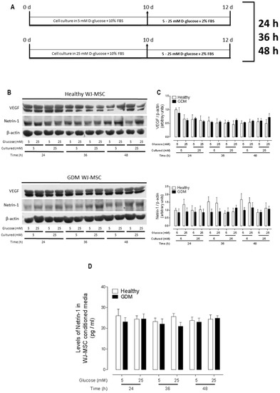 Netrin-1 expression and secretion do not change in healthy versus GDM WJ-MSC. (A) Scheme of the experimental procedures. WJ-MSC primary cultures were maintained for 10 days at the indicated glucose concentration in 10% FBS and then incubated for up to 2 more days in either 5 mM or 25 mM plus 2% FBS. Samples were collected at indicated times for analysis. The vertical arrow indicates initiation of differential d-glucose treatment. (B) Whole cell lysates were evaluated by Western blot for Netrin-1 expression in WJ-MSC from healthy and GDM cultures. VEGF was used as a positive control and β-actin was used as internal loading control. Exposure to different d-glucose concentration as indicated. (C) Data represent the mean of independent biological replicates ± SEM (healthy n = 12, GDM n = 6). (D) Quantitation of Netrin-1 by Elisa analysis. CM from healthy and GDM WJ-MSC was obtained to evaluate Netrin-1, CM was obtained with different d-glucose treatment at indicated time points (n = 4).