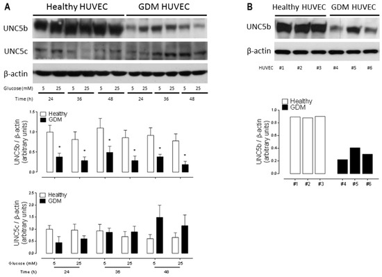 The classical anti-angiogenic Netrin-1 receptor UNC5b is decreased in GDM HUVEC. (A) Upper panel shows a representative Western blot for UNC5b and UNC5c protein expression levels in healthy and GDM HUVEC cell lysates. β-actin was used as internal loading control. d-glucose concentration and time points as indicated. Graphs below show quantified results corresponding to the mean ± S.E.M. (healthy n = 3, GDM n = 3). * p < 0.05 vs. healthy. (B) Different HUVEC from fresh umbilical cords randomly selected are indicated as #1-6. Western Blot revealing UNC5b protein expression levels in primary cell cultures (0–1 passages) of |healthy and GDM HUVEC. β-actin was used as internal loading control. Graph below shows receptor expression per replicate, labelled #1, #2, #3 for healthy and #4, #5, #6 for GDM HUVEC.