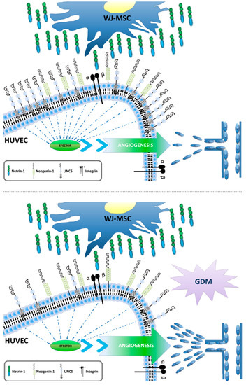 This research is an extension of previous work in which we demonstrated that Netrin-1 is a critical paracrine regulator of angiogenesis and signals independent of the RhoA/ROCK signalling pathway [13]. Here we further extended the observation that Netrin-1 is highly expressed by WJ-MSC and binds to its anti-angiogenic receptor UNC5b located in adjacent endothelial cells, which has a lower expression in GDM, suggesting a relevant contribution to develop this pathology (Figure 5). Therefore, it is relevant to consider that the stromal/endothelial niche is essential to preserve functional placental angiogenesis for the maintenance of normal foetal development and that maternal diet/exercise as treatment of GDM is not sufficient to change the foetal metabolic derangement during pregnancy, because the foetal programming is maintained.