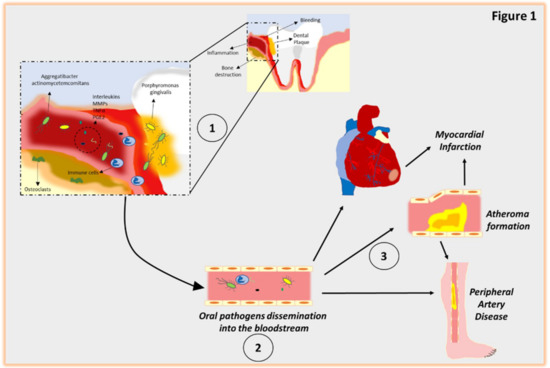 Periodontitis is a multifactorial, chronic inflammatory disorder, that can lead, if untreated, to the non-reversible damage of supportive tissues (periodontal ligament, cementum and alveolar bone) surrounding the teeth with consequent tooth loss [1]. Importantly, one of the major determinants of the development and progression of periodontal disease is represented by an increased concentration of pathogenic bacteria, within the dental plaque, that activates a massive noxious immune response [2]. For instance, the augmented concentration of bacterial surface molecules, such as lipopolysaccharides (LPS), stimulates the production of inflammatory mediators and cytokines that, in turn, promotes the release of the matrix metalloproteinases (MMPs). These tissue-derived enzymes then participate in the extracellular matrix remodelling and bone destruction [3,4]. Importantly, recent studies have clearly proven that these deleterious effects are not only restricted to the oral cavity but can affect the overall health of an individual. For this very reason, research involving the systemic implication of periodontitis has grown exponentially [5]. Indeed, periodontal pathogens can destroy the epithelium of the periodontal pocket thus allowing the entry of noxious endotoxins and exotoxins into the bloodstream [2]. This process leads to bacterial dissemination and systemic infection, with a consequent rise in inflammatory response. For instance, periodontal pathogens have been detected in disparate tissues and organs of the cardiovascular system including human cardiac tissue, pericardial fluids, heart valves and in atherosclerotic lesions [6,7,8,9,10,11,12,13]. For these reasons, in the last decades, periodontitis has been associated with the onset of systemic disorders including cardiovascular disease (CVDs) and diabetes [14,15,16]. In this regard, two meta-analyses, by Janket et al. and Kofhader and colleagues respectively, have evaluated the potential correlation between oral disease and CVD, concluding that periodontal disease is a potential risk factor for cardiovascular (CV) events, such as stroke and coronary heart disease [17,18]. Furthermore, it has been previously demonstrated that individuals with periodontitis have a sensible increased risk of developing CVDs, including myocardial infarction, heart failure, peripheral artery disease (PAD), atherosclerosis and stroke [16,19].