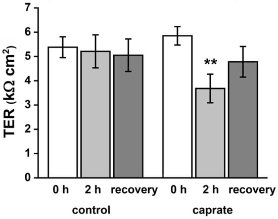 Transepithelial electrical resistance (TER) of IPEC-J2 cell monolayers. Incubation with 5 mM caprate leads to a reversible decrease of TER (** p < 0.01, n = 20).