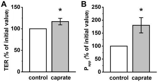 In contrast to the IPEC-J2 experiments, the TER of PP increased significantly after incubation of the tissue with caprate (240 min; 92.97 ± 4.94% to 116.73 ± 7.55%, * p < 0.05, n = 11–12) (Figure 2A). However, the permeability measurements of sodium fluorescein revealed a marked increase to 180.24 ± 29.52% (* p < 0.05, n = 8; Figure 2B).