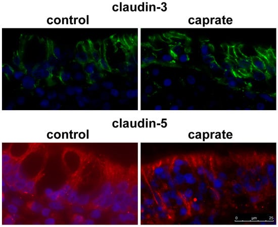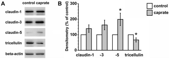 The study has shown that claudin-5 and tricellulin have been removed from bi- and tricellular TJ through caprate incubation []. TJ are apicolateral epithelial cell membrane contacts determining paracellular permeability [,,,]. Claudin-5 is classically regarded as a sealing claudin, since it increases barrier properties by effects on TER [,].