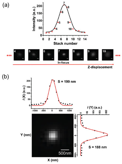 As noted above, the out-of-focus background due to autofluorescence is minimized, so 3D movement of all the particles can be monitored at the same time and, consequently, the location of UCNPs at the specific binding can be visualized [16,24]. The experimental approach to 3D localization of UCNPs can be categorized into two types of techniques: “z-scanning” and the “wide-field” scheme [16]. For 3D localization of UCNPs, the first step involves finding the focal plane and z-coordinate. To this end, z-scanning is performed using actuators, such as a stepping motor scanner or a piezoelectric scanner. Using a software code, the position of the objective or the sample holder on the microscope can be adjusted. While monitoring the emission intensity of a spot (Figure 2a), the distance between the objective lens and the sample are scanned. In order to find the focal plane, the UCNP intensity vs. frame number is plotted and fitted to Gaussian distribution. The use of Gaussian distribution as a function of z was inspired by the 2D SPT point-spread function (Equation (6)) but for the purpose of centroid determination, Gaussian is a good approximation [16].