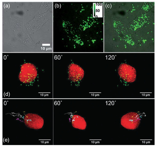 It is easy to determine from Table 1 that these methods are complementary to each other and, as for the UCNP imaging, the epifluorescence microscopic technique was found to be the best [3]. For example, the high background stemming mainly from the solvent (medium) is simply removed by the rinsing solvent while preparing the immobilized cell samples. The 3D coordinates were determined upon reconstruction (Figure 3d,e) and the outline of nuclei whose surface is covered with red fluorescent protein (RFP) is shown. Since RFP is photobleached quickly, the snapshot pictures of nuclei are taken and the laser turned off (532 nm). Moreover, in 3D images, the interesting point is whether the particles are inside and outside the organelles, such as nuclei and the mitochondria cell membrane, addressing the mechanism of internalization and release. It is worth noting that this 3D experiment was a combination of wide-field and z-scanning. The imaging speed was one 3D image per second, thus useful for fast dynamics [16,45].