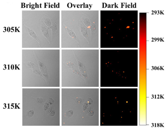 Another important function of biosensors is heat sensing via thermosensor systems [99]. Thermal mapping requires fluorescent nanoprobes with good biocompatibility and high thermal sensitivity to obtain submicron spatial resolution and subdegree thermal resolution. Shi et al. [100] treated NIH-3T3 cells with NaYF4: Yb3+, Er3+@NaYF4: Yb3+, Nd3+ core–shell nanoparticles to measure the intracellular temperature (Figure 5).