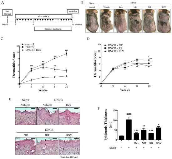 Specific pathogen-free, 5-week-old NC/Nga mice were obtained from Orient Bio Inc. (Gyeonggi-do, Korea). Prior to experiments, all mice were acclimated for 1 week to the following conditions: temperature of 23 °C, 65% humidity, and 12/12 h light/dark cycle. Animals were provided with food and water ad libitum. All experimental procedures utilizing animals were reviewed and approved by the animal care committee of the Center of Animal Care and Use (CACU; LCDI-2016-0027, 22 March 2016) at the Lee Gil Ya Cancer and Diabetes Institute, Gachon University, Korea. To induce AD-like skin lesions, hairs from approximately 8 cm² of the dorsal skin of mice were removed, following which 200 µL of 0.4% DNCB solution (dissolved in a 1:3 mixtures of acetone and olive oil) was applied twice per week for five weeks. Mice were divided at random into five treatment groups (7 mice per group): (1) naive mice (vehicle); (2) DNCB only (DNCB 0.4% (w/v)); (3) DNCB + Dexamethasone (Dex; 0.1% (w/v), 0.5 mg/200 uL); (4) DNCB + Normal Rice (NR; 2.5% (w/v), 5 mg/200 uL); (5) DNCB + Resveratrol enriched rice (RR; 2.5% (w/v), 5 mg/200 uL); and (6) DNCB + Resveratrol (RSV 2.5% (w/v), 5 mg/200 uL). After induction of AD, RR was topically applied to the dorsal skin and ears twice per week for five weeks (Figure 1A). In RR-treated mice, 200 μL of RR solution was applied topically 1 h before DNCB application each time. The severity of dermatitis was assessed once a week by three persons, according to the method described by Leung []. The total clinical index of dermatitis severity was defined as the sum of individual scores graded as follows: 0 (none), 1 (mild), 2 (moderate), and 3 (severe) for each of the five signs and symptoms: erythema/hemorrhage, edema/hematoma, excoriation/erosion, itching/dryness, and lichenification.