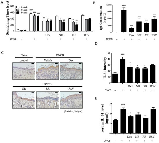 IL-6 and IL-1β secretions were measured using an enzyme-linked immunosorbent assay (ELISA). HaCaT cells were seeded (3 × 105 cells/well) in a 24 well plate and stimulated with 10 ng/mL TNFα/INFγ in the presence of NR, RR and RSV. After 24 h, the supernatants were collected and IL-6 and IL-1β secretions were evaluated using their respective ELISA kit (R&D Systems, Minneapolis, MN, USA). For measurement of serum total IgE level and IL-31, blood was collected from the mice on the last day of sacrifice. Serums were obtained by centrifugation (12,000 rpm, 10 min) and stored at −80 °C. Total serum IgE quantification was performed using a mouse IgE measurement kit (Invitrogen, Carlsbad, CA, USA) and IL-31 quantification was performed using IL-31 ELISA kit (R&D Systems, Minneapolis, MN, USA).