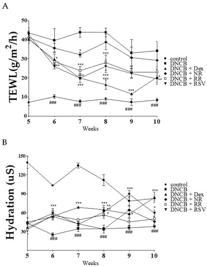 Effect of RR on TEWL and hydration in DNCB-induced NC/Nga mice. (A) The level of TEWL; and (B) the level of hydration in NC/Nga mice dorsal skin were measured using the Derma Combo system every week. Values are expressed as means ± SEM. ### p < 0.001 versus vehicle group; * p < 0.05, ** p < 0.01, and *** p < 0.001 versus DNCB-treated group. DNCB, 2,4-dinitrochlorobenzene; RR, resveratrol-enriched rice; SEM, standard error of the mean; TEWL, trans-epidermal water loss.