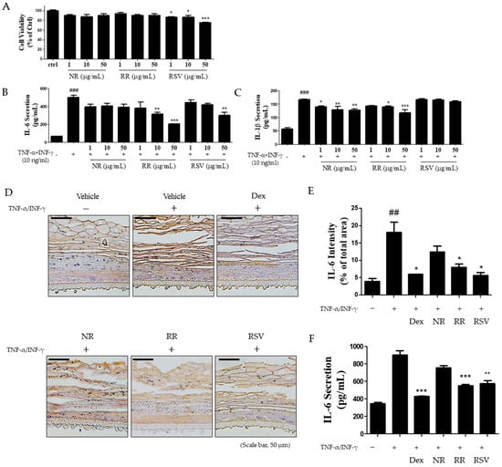 To investigate an optimal effective range of concentration of RR in human keratinocytes, we treated HaCaT cells with NR, RR, and RSV concentrations ranging from 1 to 50 μg/mL for 24 h. As shown in Figure 4A, no significant changes in cell viability were noticed after RR treatment at these concentrations. We further examined the inhibitory effect of RR on inflammatory cytokine secretion in TNF-α/IFN-γ-stimulated HaCaT cells. RR treatments could significantly inhibit both IL-6 and IL-1β secretions in a dose-dependent manner as compared to NR or RSV treatment alone (Figure 4B,C). We also measured the expression of IL-6 by IHC in the 3D skin tissues: IL-6 was highly expressed in epidermis layer of skin tissue following treatment with TNF-α/IFN-γ. However, RR treatments significantly decreased the level of cytokine expression in skin tissue and secretion (Figure 4D–F). Furthermore, RR treatments in skin of DNCB-induced mice showed that serum level of IL-6 and INF-γ were decreased by RR treatment similar to dexamethasone, but NR and RSV did not significantly reduce INF-γ level (Figure S1). These results imply that RR inhibited TNF-α/IFN-γ-increased secretion of inflammatory cytokines in human keratinocytes.