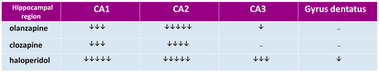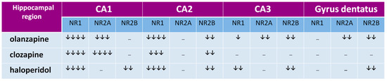 The influence of chronic antipsychotic drug administration on NMDA receptor subunits’ expression in CA1, CA2, and CA3 hippocampus regions and in gyrus dentatus in rats. Arrows indicate the subunit expression decrease by 0–25% (↓), 26–50% (↓↓), 51–75% (↓↓↓), and 76–100% (↓↓↓↓).