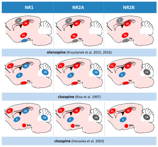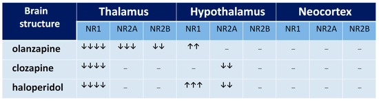 In the present work, we compared and concluded results from a series of our own studies, aimed at analyzing the influence of antipsychotics on the expression of NMDAR subunits in the rat brain. We performed immunohistochemical studies of the influence of four-week intraperitoneal administration of olanzapine, clozapine, or haloperidol on the expression of NMDAR subunits: NR1, NR2A, and NR2B in CA1, CA2, and CA3 hippocampal regions, gyrus dentatus, neocortex, thalamus, and in subthalamus [66,67]. Obtained results show that the expression of NMDAR subunits has different modality, depending on the brain area and the used antipsychotic.