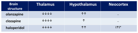 Concluding, all three antipsychotic drugs can increase the glutamatergic activity in the hypothalamus. We are aware that the hypothalamus is not generally considered as the structure directly involved in the pathogenesis of cognitive dysfunction and hypofrontality. As the whole brain region, it is not a part of corticolimbothalamic loop, however it may be important in the analysis of some adverse effects of antipsychotics, e.g., neuroleptic-induced food-intake promoting action of neuropeptide Y (NPY) and orexins (OXs), which seem to depend on the hypothalamic NMDAR activity of NMDA [103,104]. Thus, an increase in the NMDAR expression as well as NPY and OXs in the hypothalamic nuclei [105], may be one of several causes of the well-known unwanted metabolic disturbances after treatment with antipsychotics.