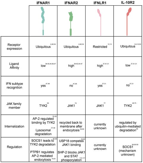 Figure 2. Regulation of interferon-mediated receptor signaling. Table summarizing the current state of the knowledge of both interferon receptor tropism, binding affinity for interferons, internalization/recycling mechanism and their known regulation.