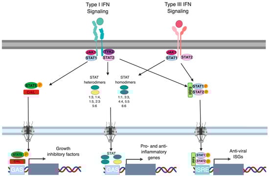 In the canonical type I and type III IFN signaling pathway, the proteins responsible for signal transduction downstream both type I and III IFN receptors and JAKs are STAT1, STAT2 and IRF9. As these proteins are interferon-stimulated gene themselves, transcriptional regulation of their expression represents an important feedback loop regulating IFN signaling. For example, it has been shown that multiple cell types secrete low levels of IFN-β under homeostatic conditions which mediates basal levels of STAT1, STAT2 and IRF9 [95]. The origin of this basal secretion of type I IFN is not fully understood but, in the gut, it has been proposed that under homeostatic conditions, both epithelial and immune cells can sense the commensal flora leading to a controlled production of low levels of IFNs [96]. Contrary to these homeostatic conditions where low levels of IFNs are secreted by cells, the presence of pro-inflammatory signals such as TNF-α and IL-6 can lead to higher expression levels of STAT1 and IRF9 which ultimately result in a prolonged ISG expression and sustained antiviral protection [97,98,99]. For type I IFNs, in addition to STAT1/2, STAT3-6 have been shown to be transcriptionally upregulated, in turn enhancing the antiviral and anti-proliferative actions of these IFNs [100,101,102,103]. While STAT1, STAT2 and STAT3 are induced downstream type I IFNs in most all cell types, STAT4, STAT5 and STAT6 are induced in a cell type dependent manner and results in unique signaling complexes in these cell types (e.g., STAT5 activation along with the CrkL adapter lead to the induction of a specific subset of ISGs) [104]. Similar to type I IFNs, STATs 1-5 have been described to be induced downstream the type III IFN receptor [80,92,105]. However, whether activation of STAT 3, 4, 5 following type III stimulation is associated with cell type specific functions and gene inductions remains to be fully addressed (Figure 3).