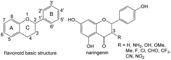 The flavonoid basic structure consists of two benzene rings (A and B) connected by an oxygen-containing pyrene ring (C) (Figure 1). To date, more than 6000 flavonoids have been identified. Flavonoids possess a broad range of biological activities including antibacterial, antiviral, anti-inflammatory and anti-ischemic activities [,,,], which are closely related with their free radical scavenging activities. It is reported that flavonoids play their anti-inflammatory action mainly via the ability to modulate production of free radical by phagocytic leukocytes []. Naringenin (4′,5,7-trihydroxyflavanone, Figure 1) is a dietary flavonoid abundant in foods such as citrus fruits, honey, and bee pollen. Naringenin has attracted increasing attention due to its positive health benefits in the human body. It has been reported to have several biological effects, such as monoamine oxidase inhibitory [] and neuroprotective activities []. Monoamine oxidase inhibitory and neuroprotective activities of naringenin may provide protection against oxidative neurodegeneration and alleviate central nervous system disorders such as depression [].