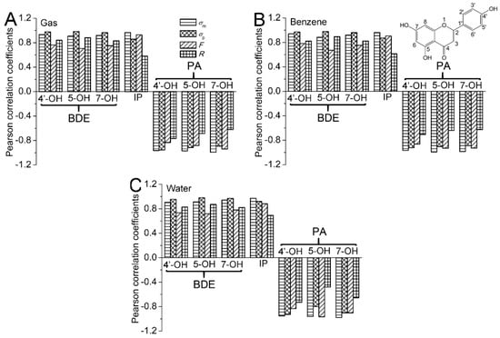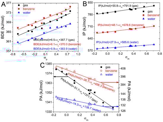 The Pearson correlation coefficients between the Hammett sigma constants (σm and σp)/F/R and the BDE/ ionization potential (IP)/ ionization potential (PA) in the gas (A), benzene (B) and water (C) phases.