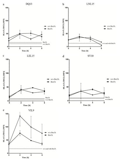 Surface stability of distinct p:HLA-E complexes over a time period of 6 h. T2E cells pre-loaded with one of the five test peptides (a–e) was incubated with or without BrefA. Binding of the HLA-E specific mAb 3D12 to these cells was analyzed by flow cytometry over 6 h. The depicted values at each time point are the means of three independent experiments ± SEM. The dashed lines indicate the MFI after 50% of the complexes decayed. The crossing of a curve with this line marks the DT50 (reported in Table 2). BrefA: Brefeldin A.