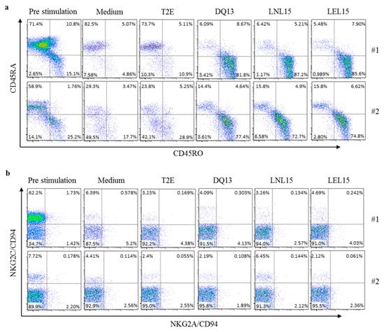 To determine if the respective proliferated CD8+ T cell population shows a shift from naïve state into effector memory cells, we determined the surface expression of CD45RA and CD45RO before and after stimulation with T2E cells. The stimulation of CD8+ T cells with distinct p:HLA-E complexes resulted in the loss of CD45RA+ cells that represent naïve T cell populations and the gain of CD45RO+ expression on CD8+ T cells that were encountered, with T2E cells presenting the DQ13, LNL15 or LEL15 peptide (Figure 4a). The expression of the CD45RO effector memory marker is in line with the strong T cell proliferation response that was induced by these peptides. CD8+ T cells stimulated with the SY10 or VIL9 peptide showed no shift in CD45RO expression in comparison to CD8+ T cells that were co-incubated with T2E cells without peptide. The effect of HLA-E antigen presentation on the cell surface expression of NK cell receptors, in particular the NKG2A/CD94 or NKG2C/CD94 receptor, on the examined CD8+ T cell population was analyzed to determine if there is a correlation between T cell activation and NK cell receptor expression induced by HLA-E (Figure 4b). The surface levels of NKG2C/CD94 on CD8+ T cells derived from donor #1 showed a highly positive subpopulation with 62% for this receptor before stimulation with T2E cells, whereas CD8+ T cells derived from donor #2 contained only around 8% of a subpopulation positive for the NKG2C/CD94 receptor. However, when we examined HLA-E complexes bound to DQ13, LNL15, or LEL15 that induced proliferation and expression of CD45RO, an almost complete loss of this NKG2C/CD94+CD8+ T cell subpopulation within the CD8+ T cells derived from the tested donors was observed. Regarding the NKG2A/CD94+ subpopulations of CD8+ T cells, no distinct shift could be observed compared to pre-stimulation.