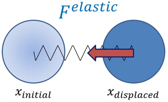 For elastic interaction of particles with the polymer matrix, we use simple spring approach [,]. Each particle is assumed to be connected with its initial position by a “virtual” spring (see Figure 2). When a particle is moved from its initial position, the spring stretches and acts to return particle back. Thus, each particle is assumed to be in the field of elastic force, which tends to return the particle to the initial position if a displacement happens.