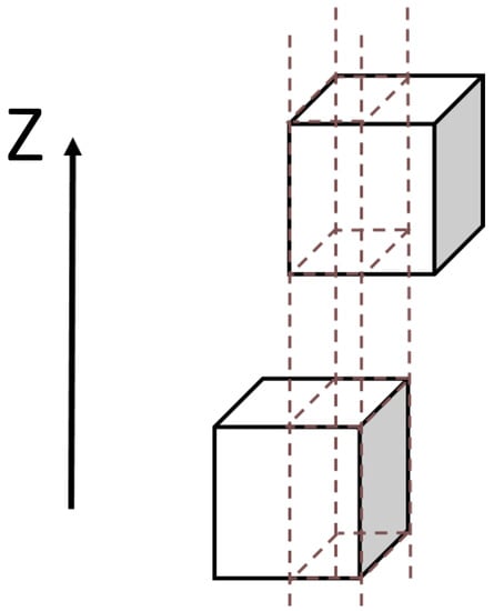 To use area cap approach, we approximate spherical particles with axis-aligned shapes (cuboids). In addition, we assume that electric field inside the capacitor is not changed and remains uniform and constant. Therefore, we can approximate our sample as a system of interconnected planar capacitors. To determine a total capacitance, we split volume along the z-axis, as shown on Figure 3, which is perpendicular to the capacitors plates, into areas, so that each particle either completely overlaps this area or does not overlap at all. In this way, each slice along z-axis is a series of capacitors, while the slices are connected in parallel. To obtain such partition, we need to review projections of particles onto the plane . Therefore, the problem is reduced to the analysis of two-dimensional geometry.