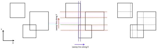 To solve this problem, the sweep line algorithm was used. The sweep line is an imaginary line running along the x-axis in one direction. It processes “events”—in our case an event is the crossing with particle boundaries. After registration of two consecutive events, we get the narrow band at which second line starts running along the y-axis, splitting the particles projection at each “event” of crossing the particle borders (Figure 4).
